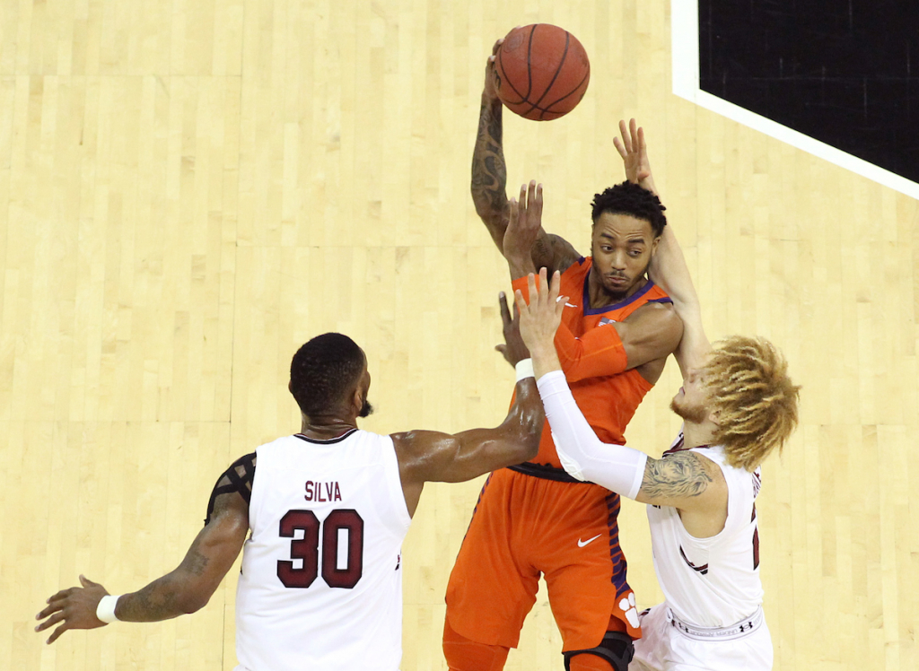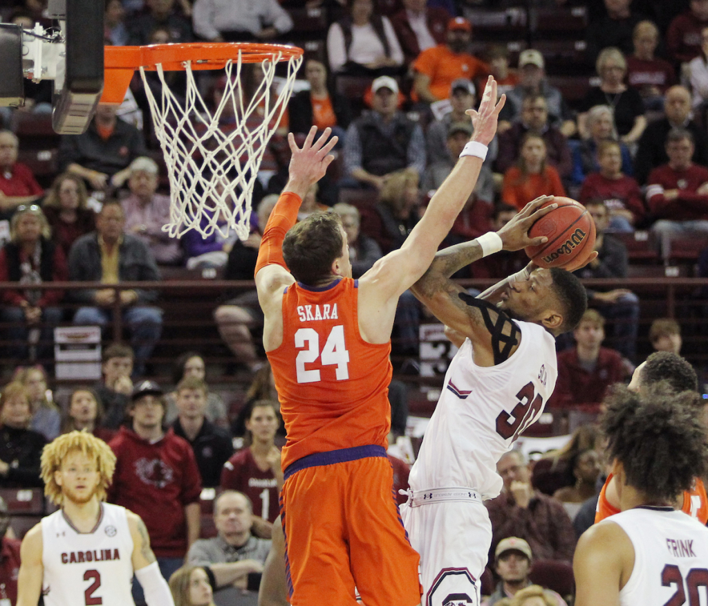 [su_dominion_video_scb]The Gamecocks started strong against Clemson, leading by seven points in the first half after senior guard Hassani Gravett drilled a three-pointer with 11:53 remaining in the opening stanza. But a 9-0 run gave Clemson a two-point lead less than three minutes later.
