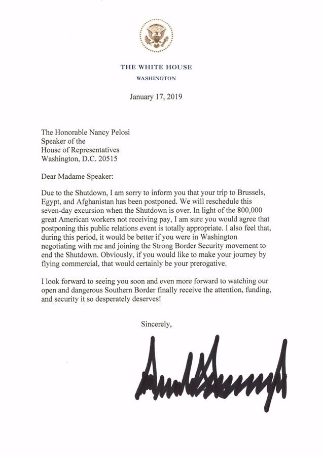 In a letter sent to the powerful Democratic leader, Trump informed Pelosi “your trip to Brussels, Egypt and Afghanistan has been postponed.”