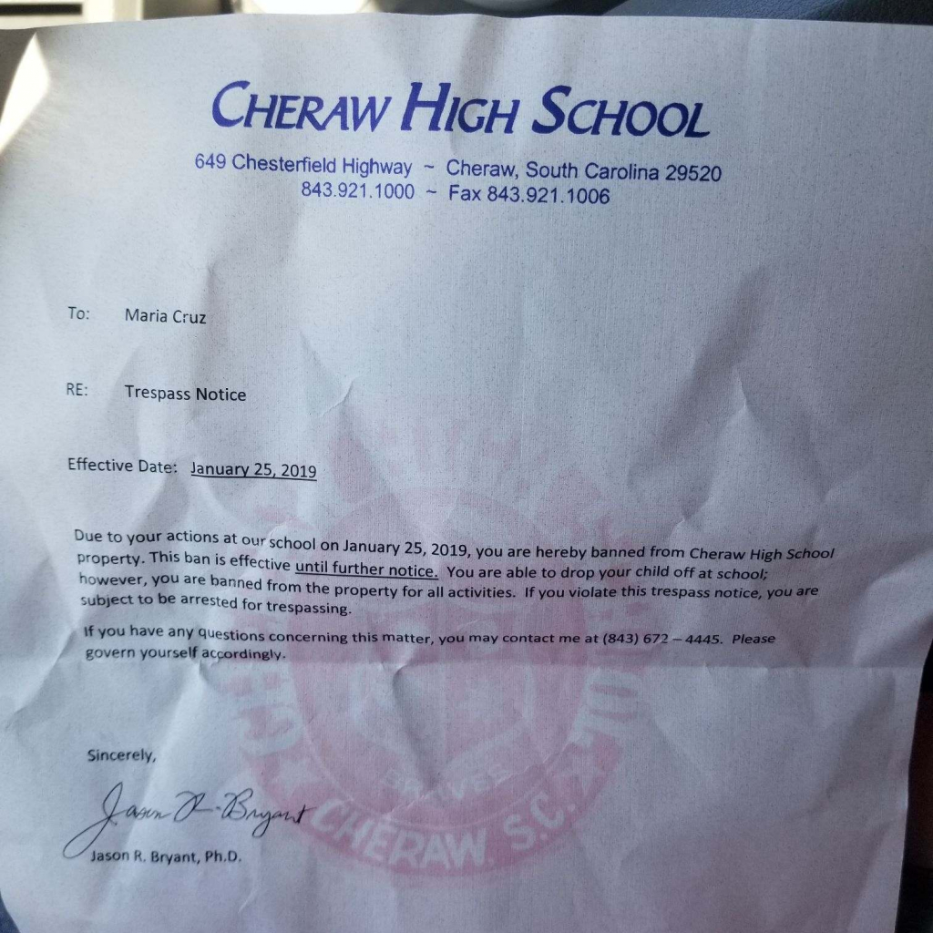 Eventually, school officials appear to have grown weary of Cruz’s efforts. On February 4, following a conference with one of her daughter’s academic counselors, she was provided with a letter from Cheraw’s principal dated January 25 informing her that she was banned from school property.