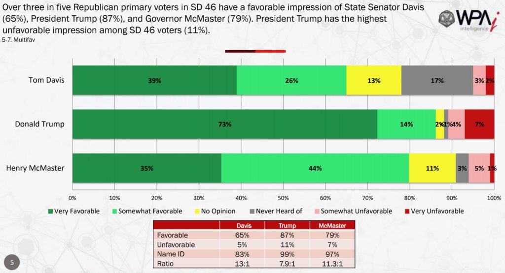 This week, we were provided with some additional evidence of Davis’ popularity. According to a survey conducted by WPA Intelligence, 65 percent of GOP primary voters in S.C. Senate District 46 (map) have a favorable impression of Davis – including 39 percent who have a “very favorable” impression. Meanwhile, only five percent of primary voters view Davis negatively – including only 2 percent who have a “very unfavorable” view of their lawmaker.