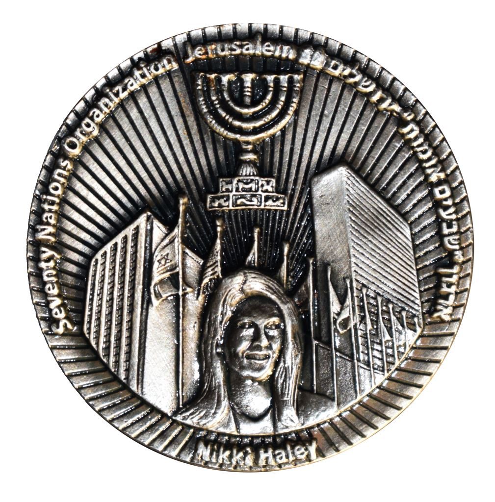 The coin in question features a likeness of Haley superimposed against the U.N. General Assembly building in New York City – with the Israeli flag occupying a position of honor (ahead of the American flag) in front of the building.