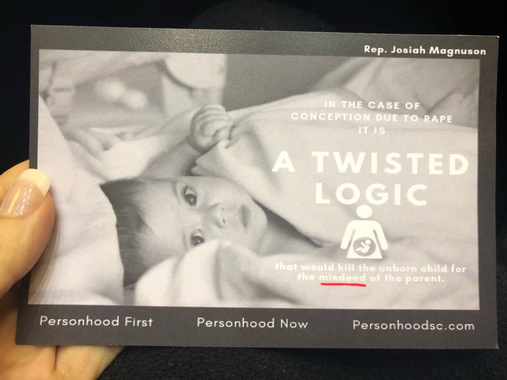 Personhood SC initiated this drama on Tuesday when state representative Josiah Magnuson placed a post card on the desk of every state representative. According to the post card, it is “twisted logic” to kill an unborn child based on the “misdeed of the parent.”