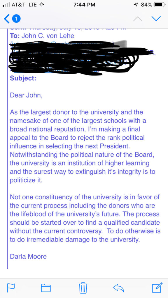“Not one constituency of the university is in favor of the current process including the donors who are the lifeblood of the university’s future,” Moore wrote.