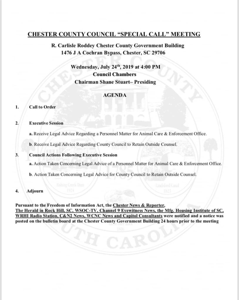 According to an agenda for a “special call” meeting of the Chester County council scheduled for Wednesday, July 24, 2019 at 4:00 p.m. EDT, local government leaders will retreat behind closed doors immediately after being called to order so as to “receive legal advice regarding a personnel matter” concerning the county’s “animal care and enforcement office.”