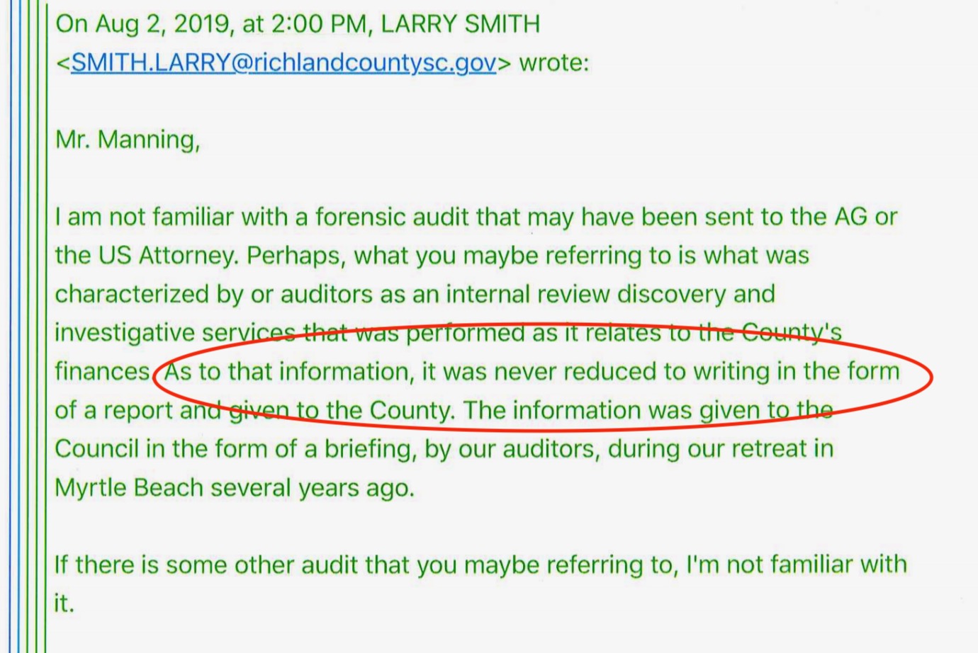 Unfazed by this brazenness, Manning responded to Smith’s admission by asking him whether the verbal, unwritten briefing he cited in his email cleared council members of “any potential Richland county financial wrong doings and such?”