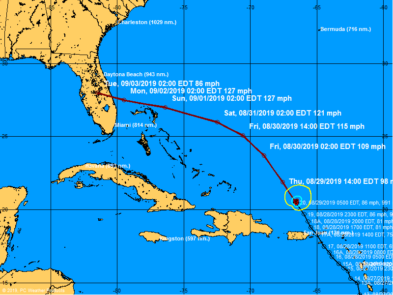 As you can see, the coast of Florida is very much in the mix for a direct hit … with a strong possibility that Dorian will be a category three storm upon making landfall.
