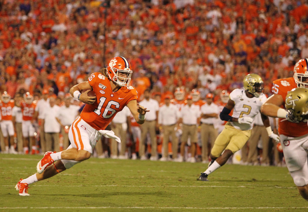 Etienne’s big night bailed out a middling performance from Clemson’s top Heisman hopeful, sophomore quarterback Trevor Lawrence. The 6-foot-6, 220-pound Cartersville, Georgia native completed only 13 of 23 passes for 168 yards with one touchdown and two interceptions. Lawrence also ran for 24 yards and one score – a six-yard keeper that gave Clemson an early 7-0 lead over the Yellow Jackets.