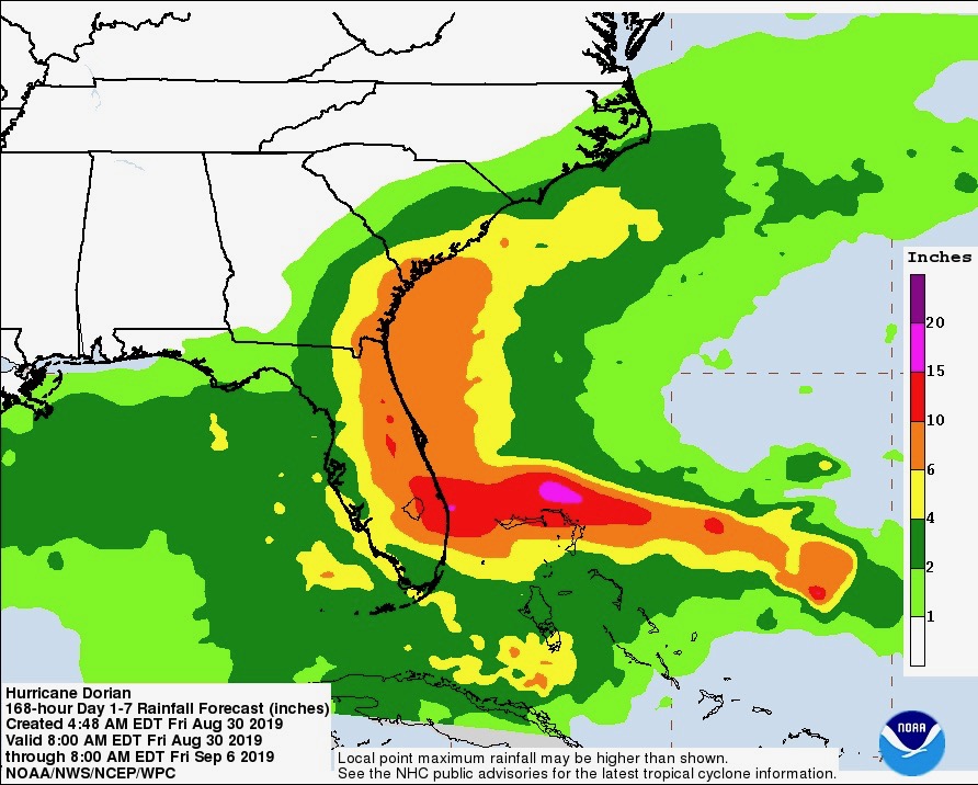 “That amount of rainfall is a part of our planning discussions,” Becker told us. “What happens in South Carolina is totally dependent on what the storm does in Florida. The next couple days will be important since it looks like Dorian has slowed down a bit.”