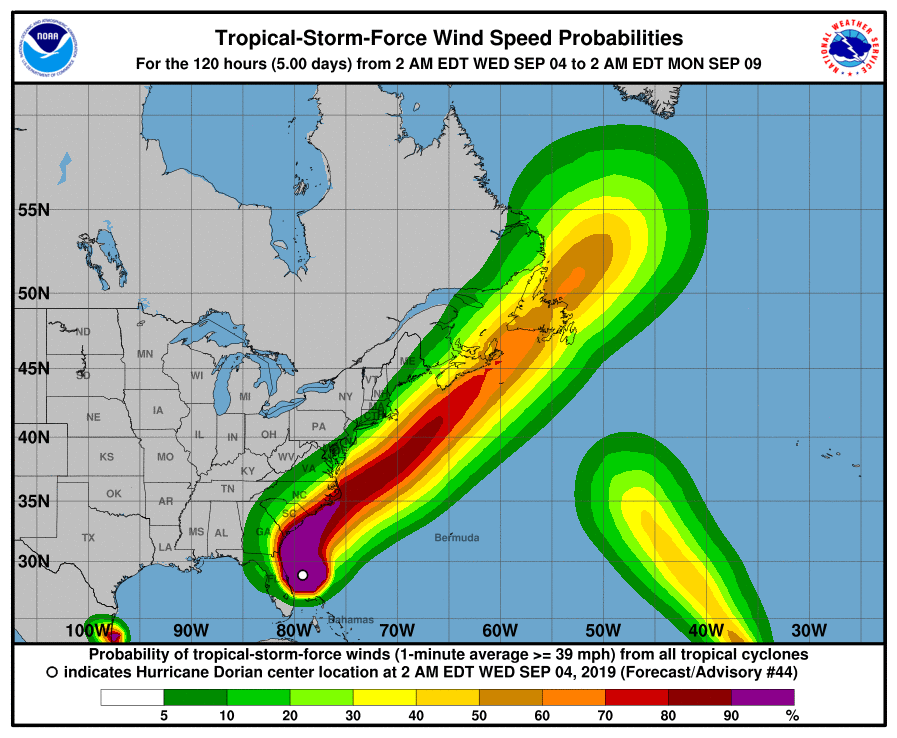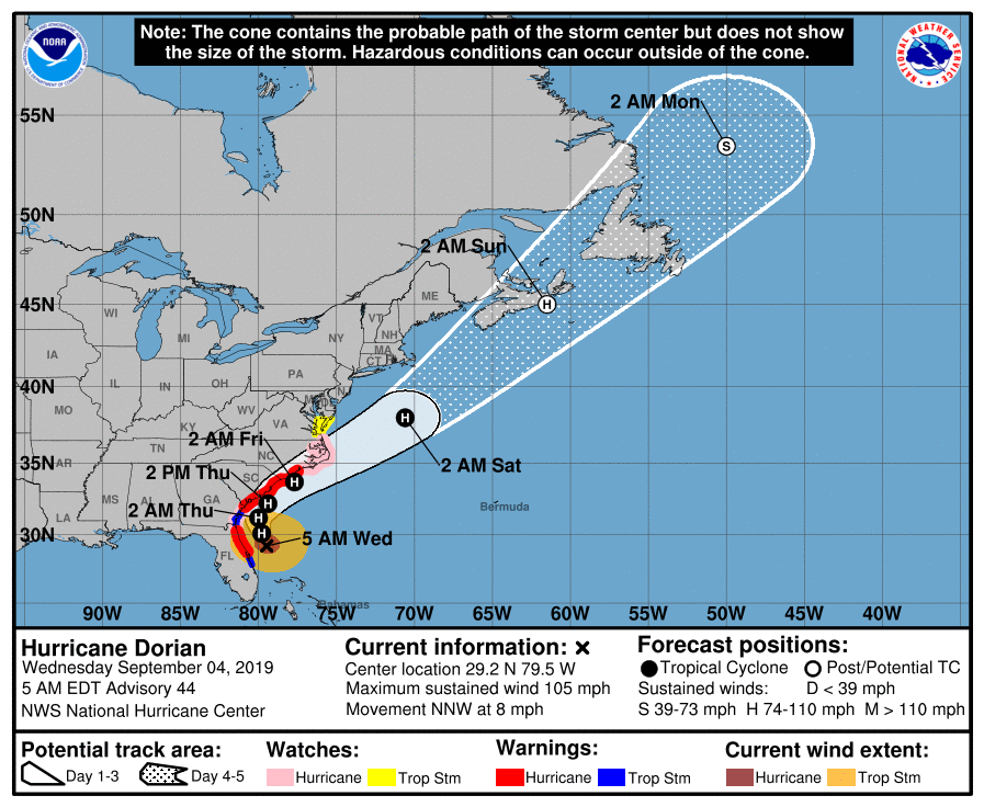 According to the 7:00 a.m. EDT updated advisory from the National Hurricane Center (NHC) in Miami, Florida, Dorian was located approximately 95 miles east of Daytona Beach, Florida moving north-northwest at eight miles per hour.