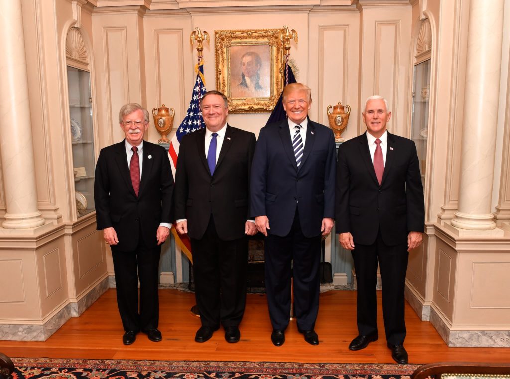 The tweets were sent less than two hours before Bolton (above, far left) was scheduled to appear at a press conference with U.S. secretary of state Mike Pompeo and secretary of the treasury Steve Mnuchin.