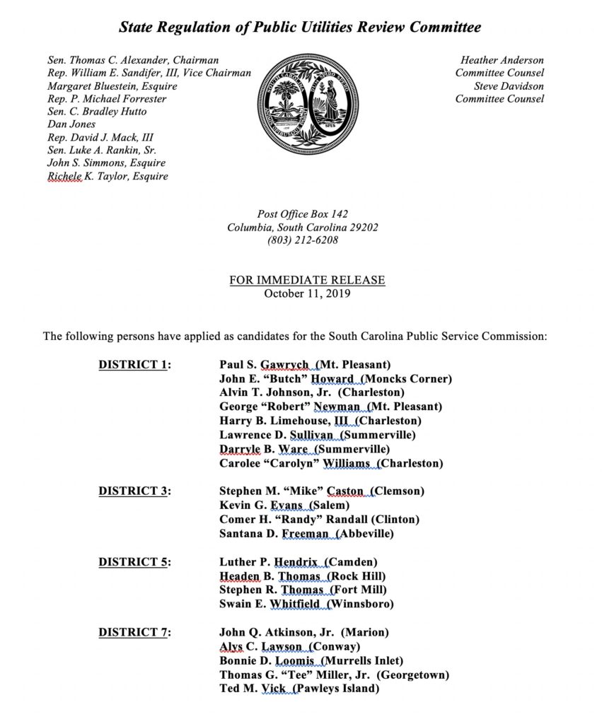 As is the case with South Carolina’s judges, the power to appoint SCPSC commissioners rests exclusively with the S.C. General Assembly. First, a legislatively controlled committee – the S.C. Public Utilities Review Committee (SCPURC) will screen the candidates and determine which ones will be allowed to stand for election. Then, a final vote on the “approved” slate will take place before a joint session of the legislature next spring.