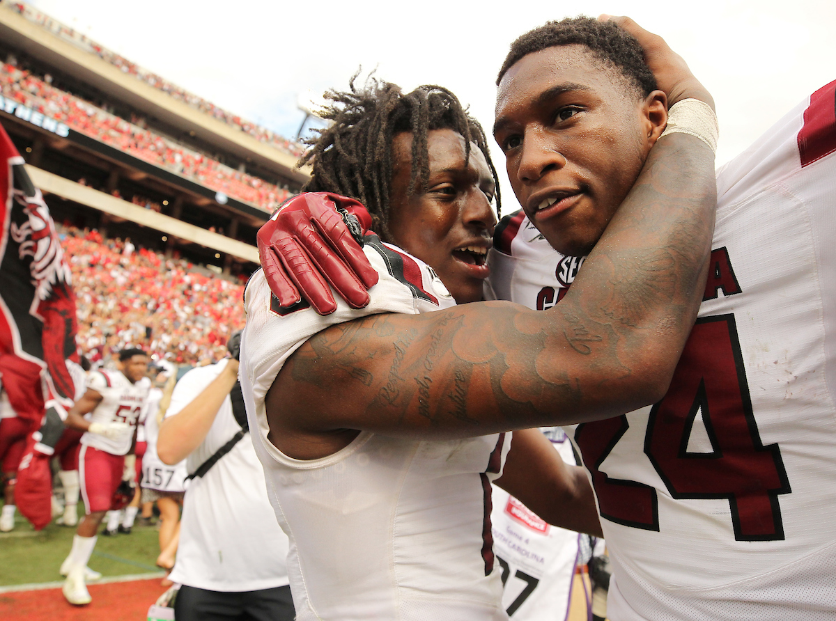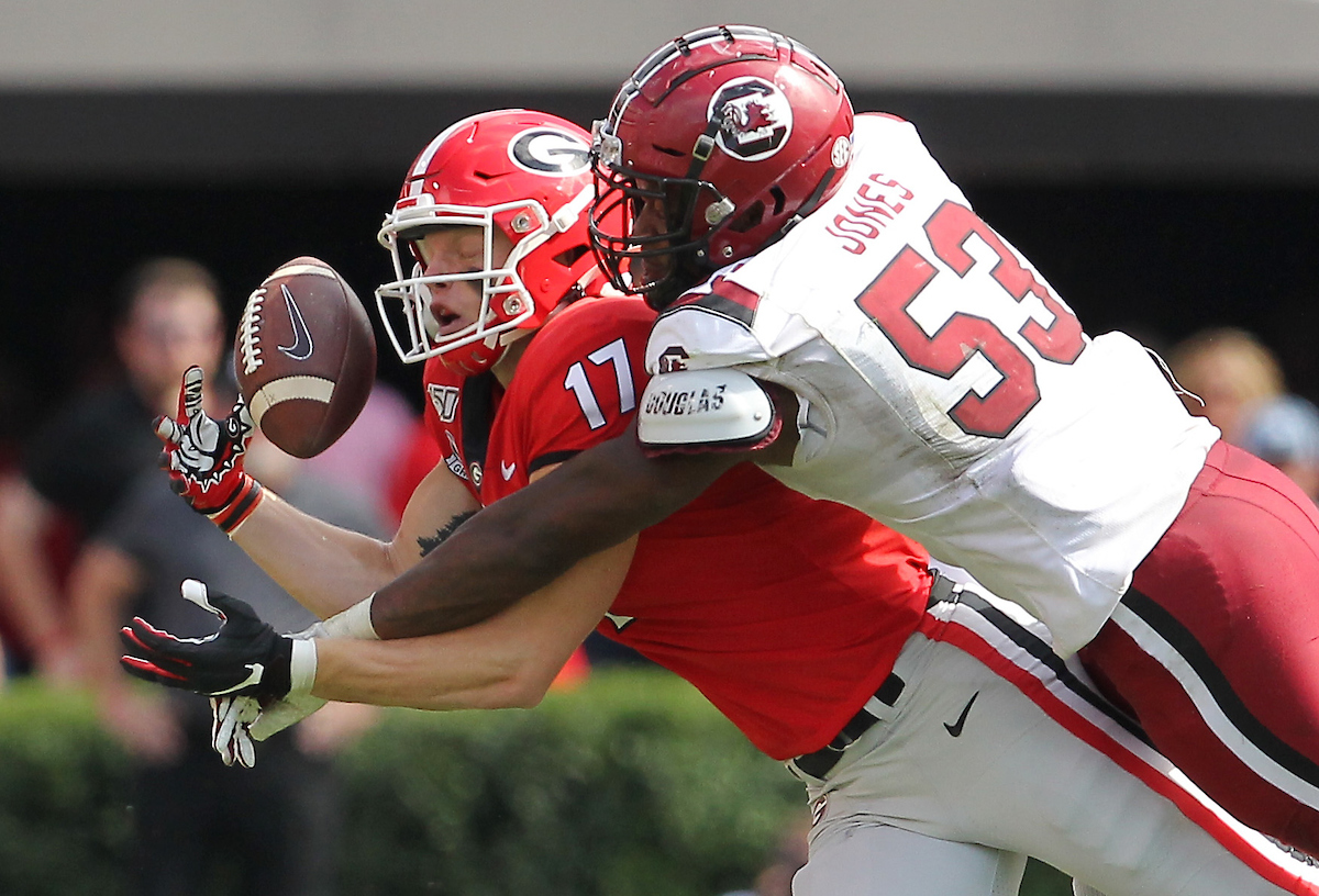 Look for Mukuamu (below) to be named the SEC defensive player of the week after his sensational performance between the hedges – where South Carolina had not won since 2011, Jadeveon Clowney’s freshman season. The Gamecocks had not beaten Georgia at all since 2014 – when Steve Spurrier was still pacing the South Carolina sideline.