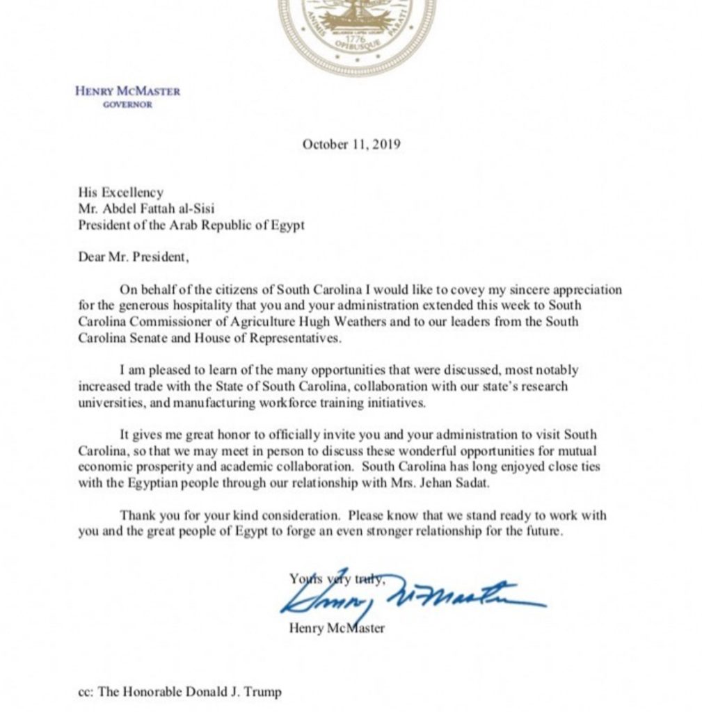 McMaster also invited Sisi to travel to South Carolina “so that we may meet in person to discuss these wonderful opportunities for mutual economic prosperity and academic collaboration.”