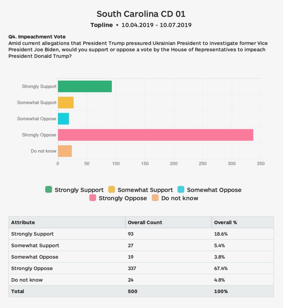 According to the survey (.pdf), published by Columbia, S.C.-based First Tuesday Strategies, 24 percent of GOP voters in this district “support a vote by the House of representatives to impeach president Donald Trump.” Of that total, 18.6 percent said they “strongly support” impeachment.