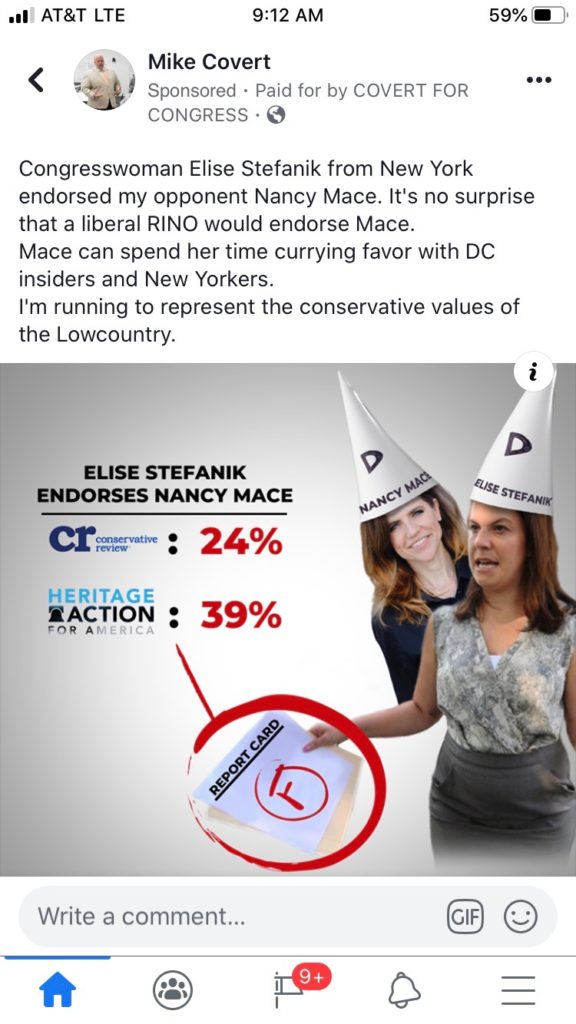 “Mace can spend her time currying favor with DC insiders and New Yorkers,” Covert wrote in a Facebook post sponsored by his campaign. “I’m running to represent the conservative values of the Lowcountry.”