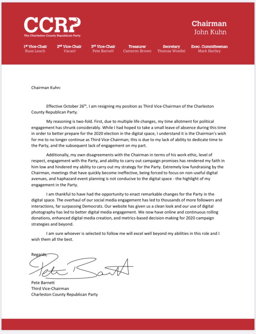 A pair of Charleston county, South Carolina Republican party officials resigned their offices earlier this month, one of them explicitly questioning the “leadership” of county party chairman John Kuhn.