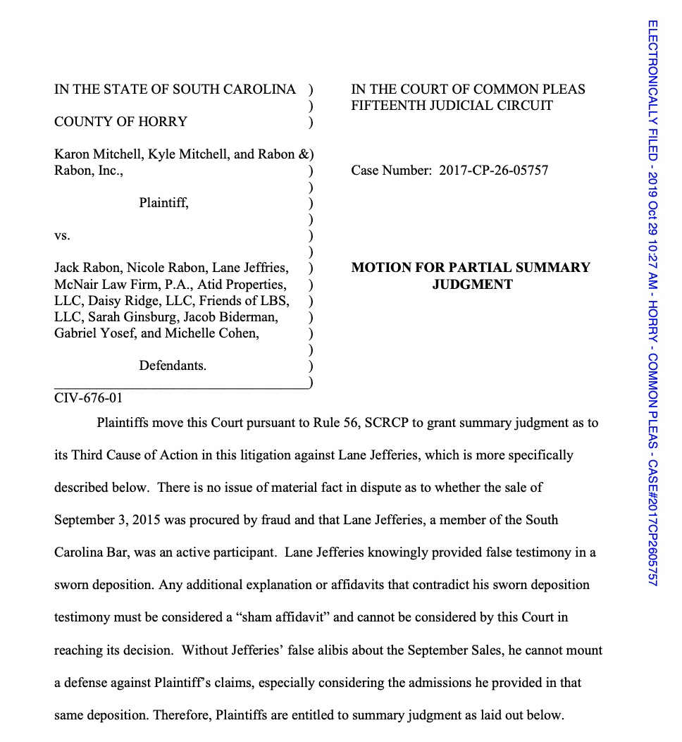 Lane Jefferies – son-in-law of S.C. supreme court justice Kaye Hearn – is said to have “knowingly provided false testimony in a sworn deposition” in connection with the case, in addition to being an “active participant” in the underlying “fraud.”