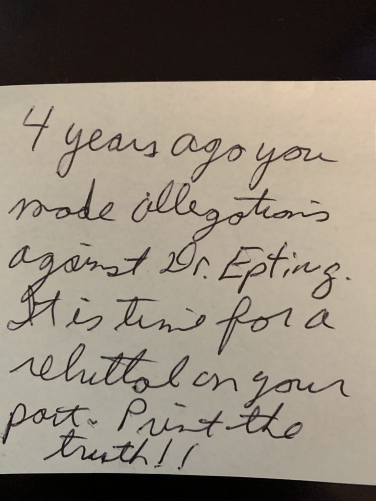“(Four) years ago you made allegations against Dr. Epting,” it read. “It is time for a rebuttal on your part. Print the truth!!”