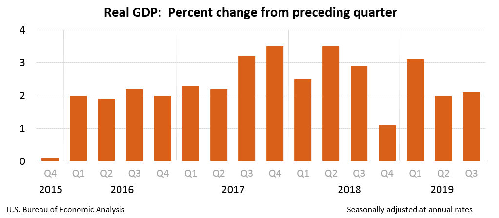 The giant sucking sound of big government has placed a drain on consumerism, which along with pressure on manufacturers from the ongoing trade war has limited overall economic growth. According to data released last week by the U.S. Bureau of Economic Analysis (BEA), gross domestic product in the United States expanded by a modest 2.1 percent during the third quarter of 2019 (from July through September). That print was up modestly from an initial third quarter estimate of 1.9 percent released last month – and just above the 2.0 percent growth rate experienced during the second quarter of the year (from April through June).