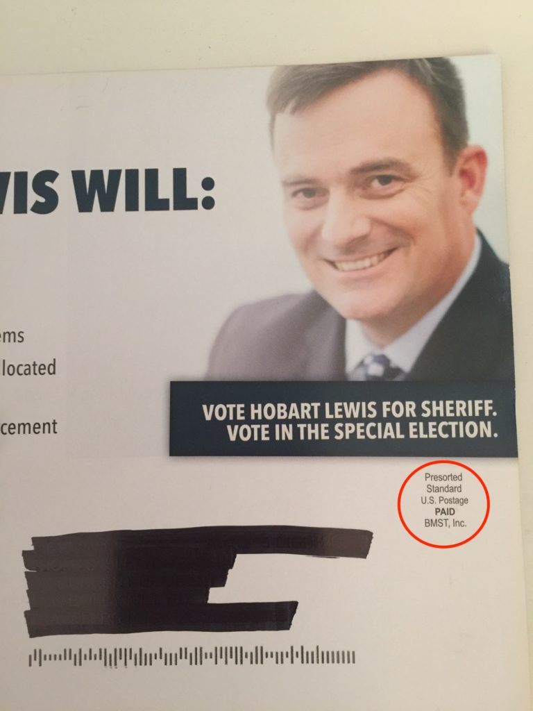 We are not lobbing any direct allegations (yet), but it is highly suspicious that the Lewis for sheriff campaign would use the same Petersburg, Virginia-based vender used by Next Policies, LLC – the suspicious political group listed as the responsible party on the recent attack mailing against his opponent.