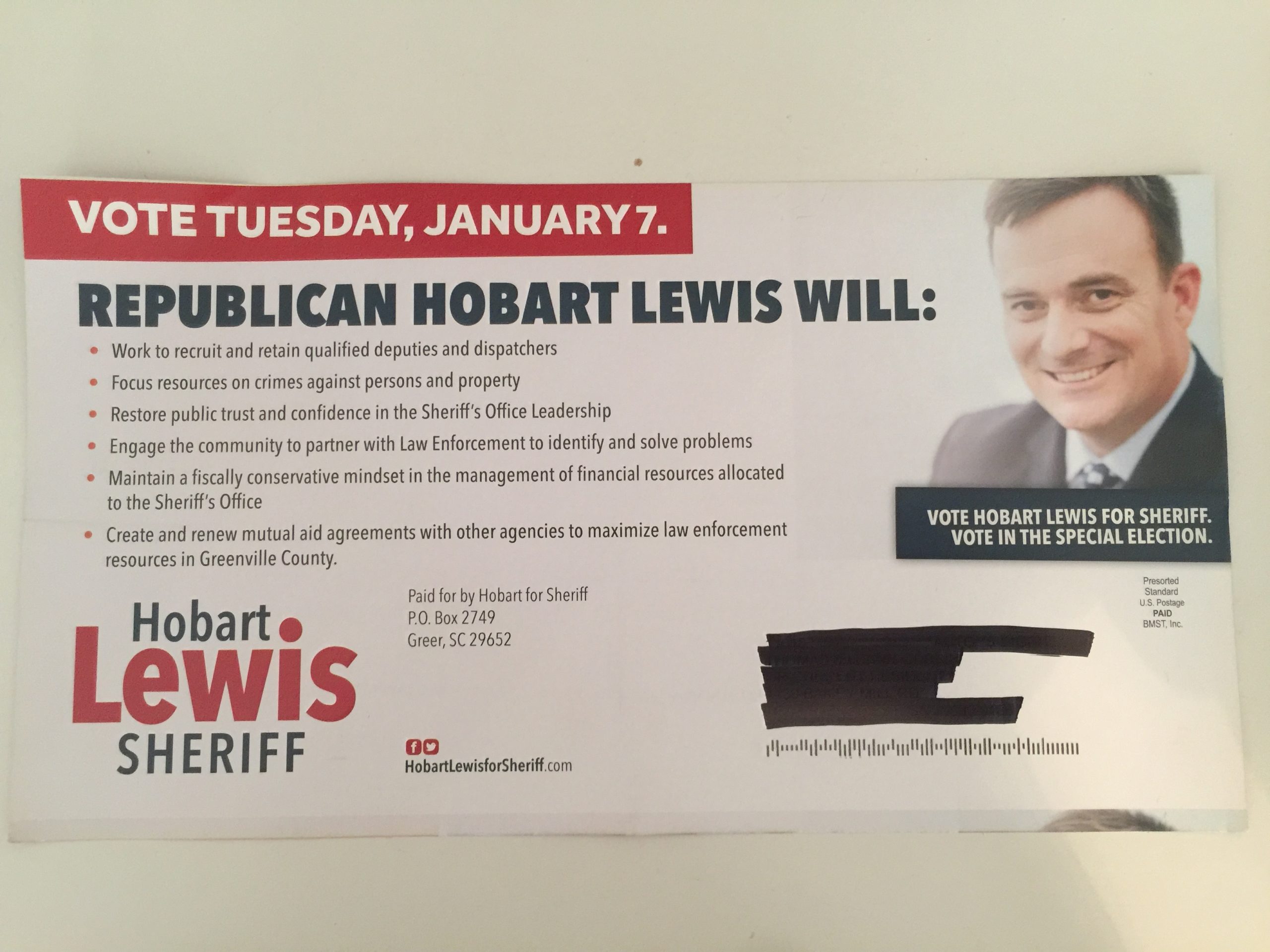 As for the Greenville sheriff’s race, Smith and social conservative (?) candidate Hobart Lewis are squaring off on January 21, 2020 in a runoff election for the Republican nomination for sheriff of Greenville county. The winner will face Democrat Paul Guy in March.