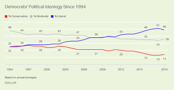 Among “more ideologically diverse” Democrats, 49 percent called themselves liberal last year – down from a record 51 percent in 2018. Meanwhile the percentage identifying as moderates ticked up from 34 to 36 percent.