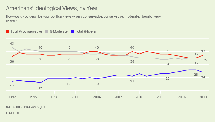 Still, there is some value to be found in dissecting the latest ideological affiliation data published earlier this month by the pollsters at Gallup. According to the numbers, America remained a “center-right” nation in 2019 – with 37 percent of its citizens classifying themselves as “conservative,” 35 percent identifying as “moderate” and 24 percent referring to themselves as “liberal.”