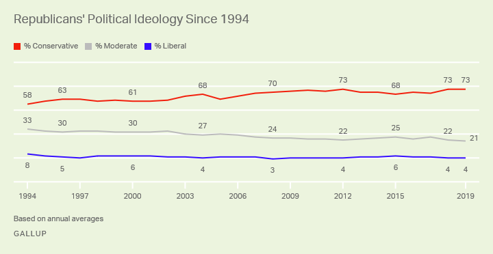 Looking at the numbers through a partisan lens, GOP voters remained staunchly “conservative” in 2019. A total of 73 percent of Republicans labeled themselves thusly, compared to only 21 percent who called themselves moderate and 4 percent who identified as liberal.