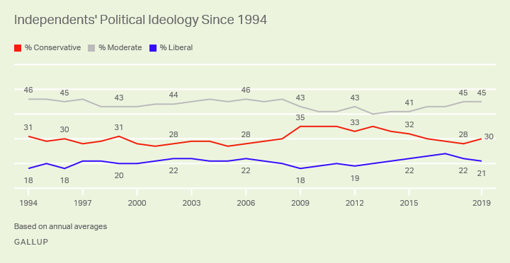 Finally, independents – who currently comprise a 41 percent plurality of the citizenry (down from 42 percent in 2018) – grew slightly more “conservative” last year, according to Gallup’s data.