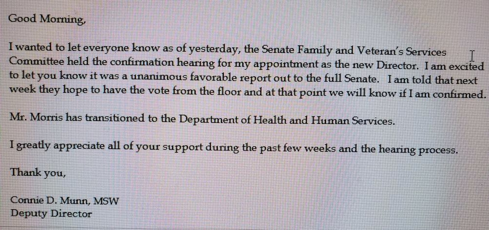 “I am excited … it was a unanimous favorable report out to the full Senate,” Munn wrote in an email obtained by this news outlet. “I am told that next week they hope to have a vote from the floor and at that point I will know if I am confirmed.”