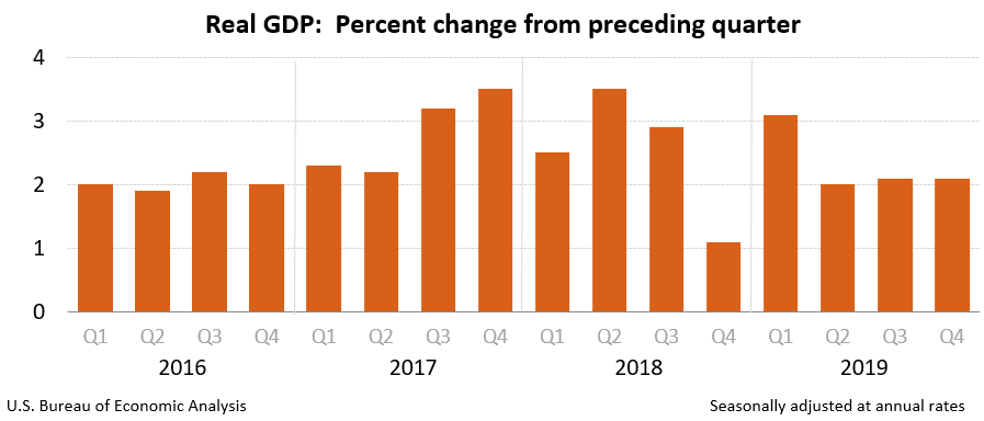 According to the advance estimate for the fourth quarter of 2019 released this week by the U.S. Bureau of Economic Analysis (BEA), economic growth expanded by 2.1 percent from October to December of last year – the same rate of growth it experienced during the third quarter of the year and narrowly better than the 2.0 percent growth rate analysts projected.