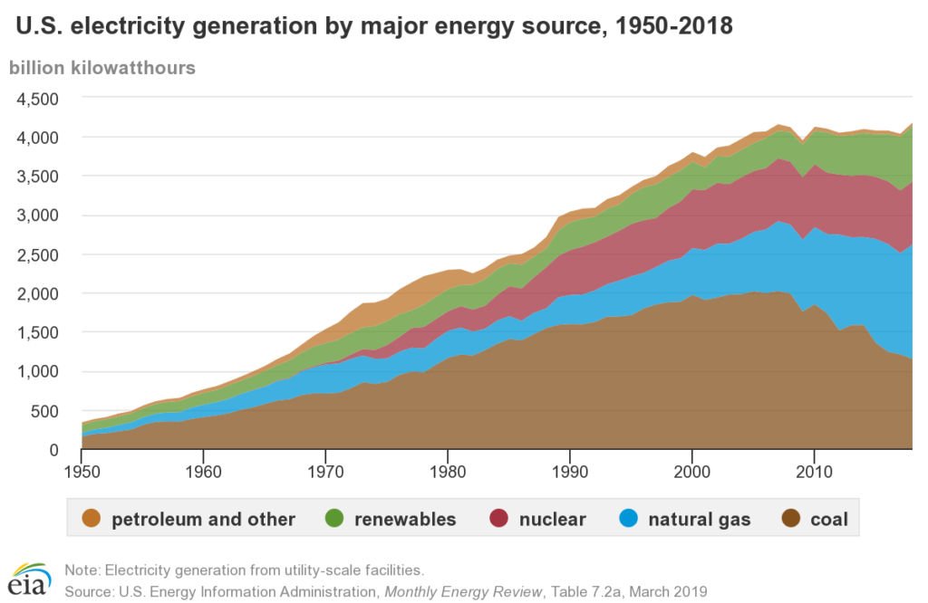 As for renewables, they comprised 736 billion kilowatt hours in 2018 – well above the 502 billion kilowatt hours originally projected.