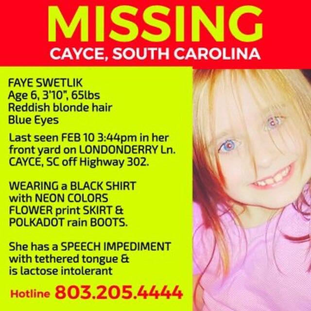The search for a 6-year-old girl from Cayce, South Carolina who was reported missing Monday afternoon continues today after more than 100 law enforcement officials searched throughout the night, officials said in a Tuesday morning press conference
