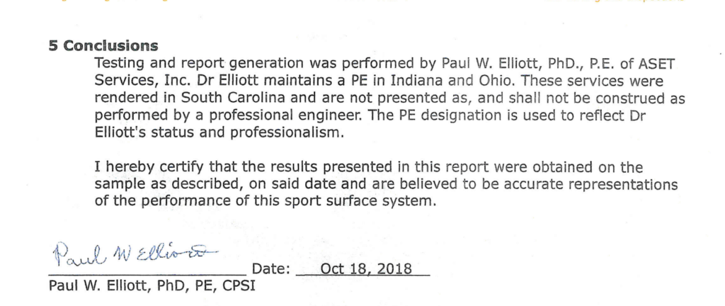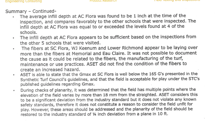 The report said that the inspector “did not find any instance where the properties of the field exceeded required safety performance standards and created a situation that was unfit for use,” but did find aspects of the field that were below industry standard (see below).