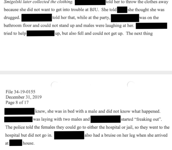 The two women – whose names were redacted from the report – were students at Bob Jones University, a staunchly conservative evangelical school located in Greenville. According to the report, the two women were described as “visibly upset” in the aftermath of the alleged incidents and “voiced concerns they would be expelled from (Bob Jones) because they drank alcohol.”