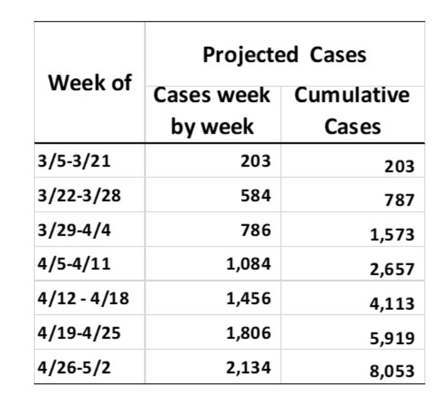 SCDHEC officials project that South Carolina will have 8,053 total cases by May 2, but those numbers are subject to change.