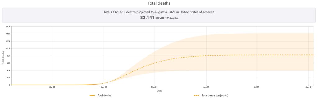 The guidance offered by federal officials mirrors updated projections released over the weekend by the Institute for Health Metrics and Evaluation (IHME) in Seattle, Washington. According to these projections, the coronavirus death toll is expected to fall anywhere between 40,000 and 142,000 over the next two-to-three months – peaking on April 15 and then declining gradually over the next six-to-eight weeks.