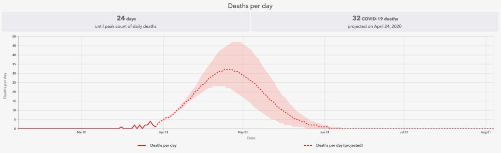 Narrowing the lens for these projections, the coronavirus is now projected to kill an estimated 1,043 people in our home state of South Carolina – with the peak hitting sometime around April 24-28 and gradually dropping to zero by early June.