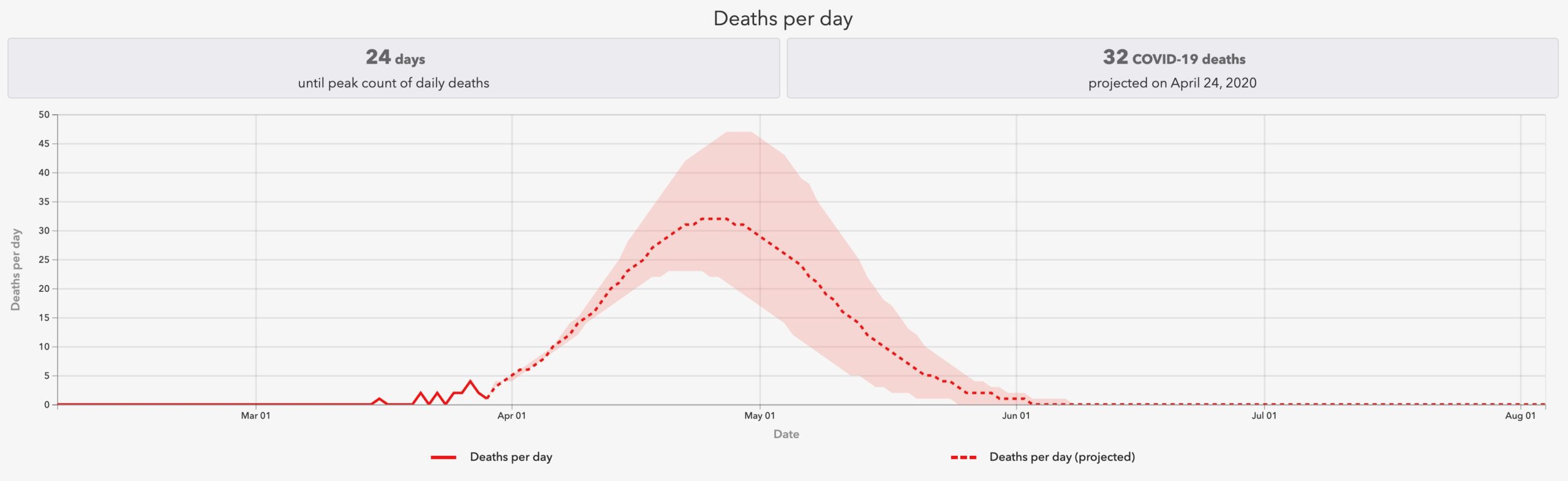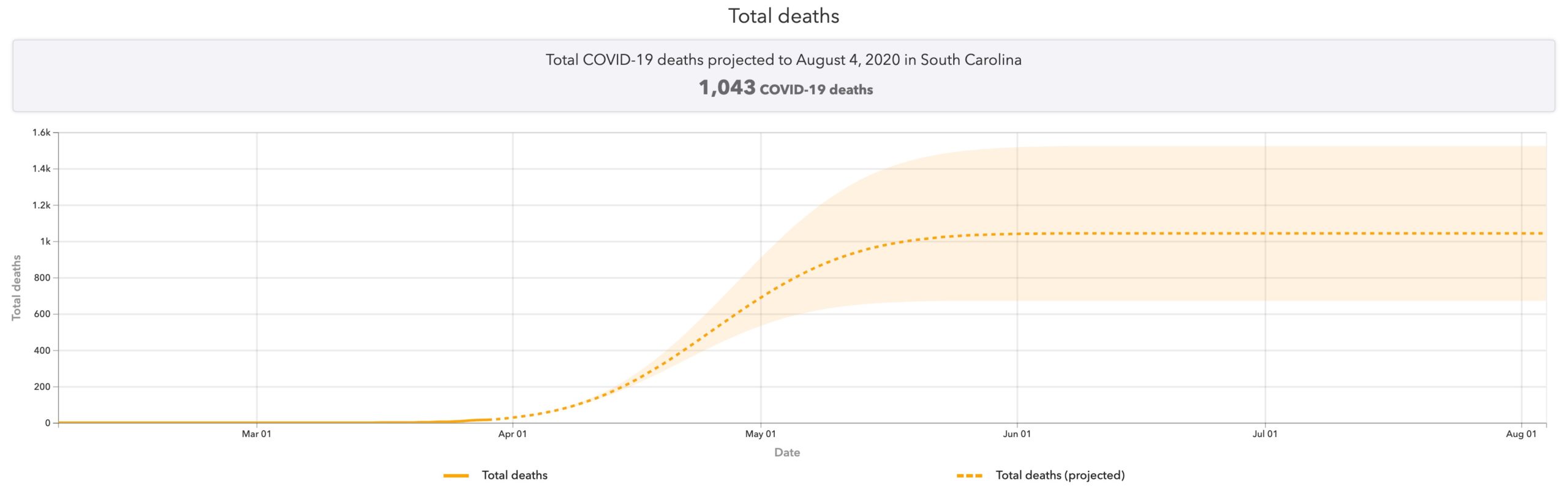 Narrowing the lens for these projections, the coronavirus is now projected to kill an estimated 1,043 people in our home state of South Carolina – with the peak hitting sometime around April 24-28 and gradually dropping to zero by early June.