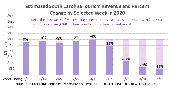 Revenue is also taking a beating.  According to Tourism Economics data released by SCPRT, “South Carolina visitor spending is down $768 million or 84 percent from the same time period in 2019.”