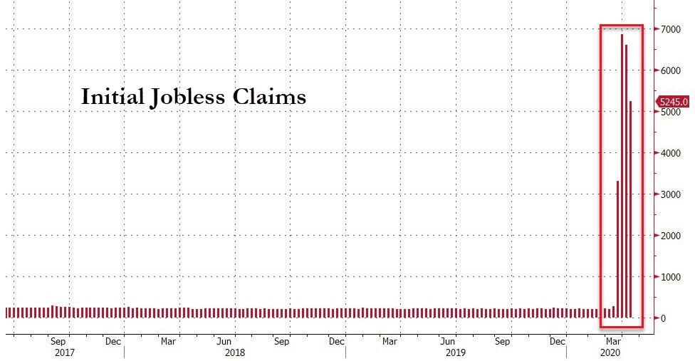 According to the latest data (.pdf – full release below) from the U.S. Department of Labor (DOL), 5.25 million Americans filed claims last week – pushing the four-week total since the pandemic shut down the economy to an astonishing 22 million.