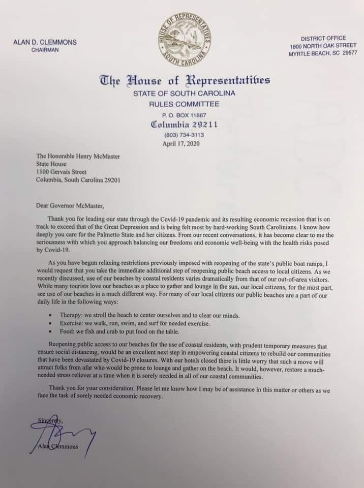 Clemmons wrote to McMaster on his committee letterhead, urging the state’s chief executive to expand on his recent decision to reopen boat ramps in the state by reopening public access to beaches.