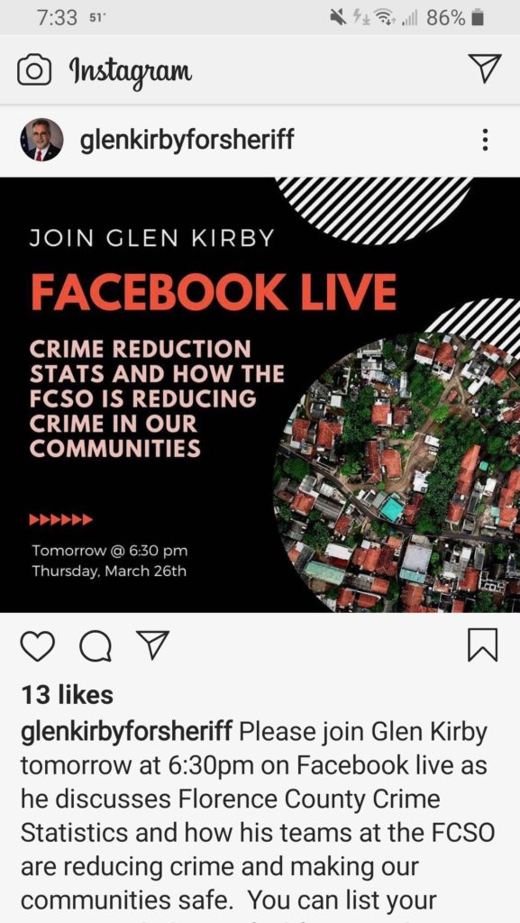 One example? Kirby recently hosted a “Facebook Live” event in which he discussed updated crime statistics – and how “his teams at the (Florence sheriff’s office) are reducing crime and making communities safe.”