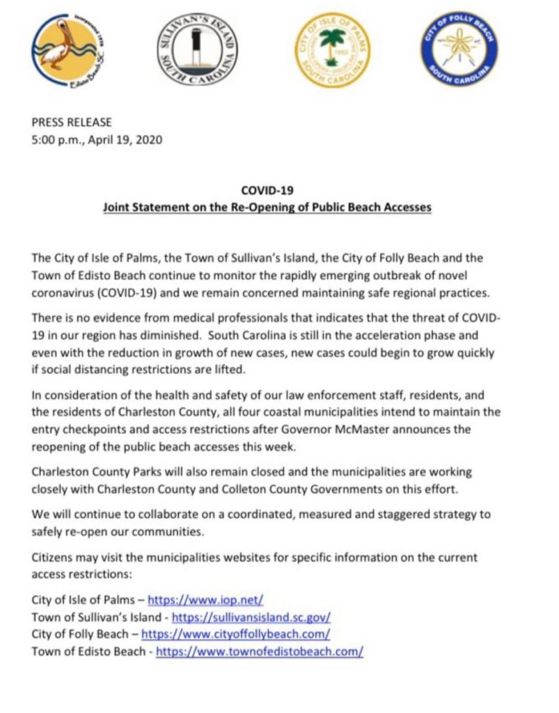 “There is no evidence from medical professionals that indicates that the threat of COVID-19 in our region has diminished,” a joint statement from the leaders of Edisto Beach, Sullivans Island, Isle of Palms and Folly Beach noted. “South Carolina is still in the acceleration phase and even with the reduction in growth of new cases, new cases could begin to grow quickly if social distancing restrictions are lifted.”