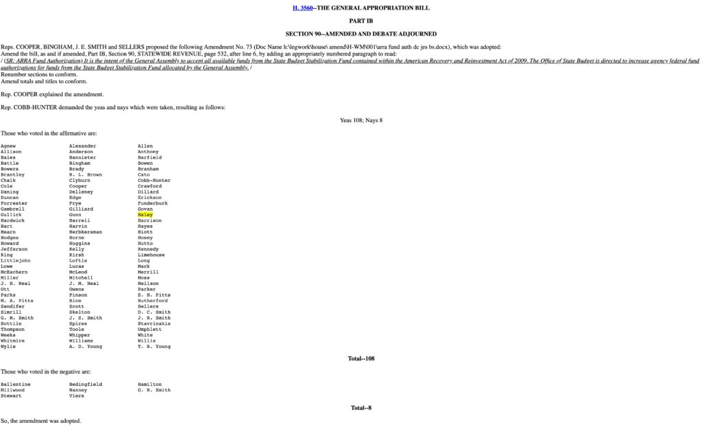 Haley, incidentally, voted in favor of accepting that $700 million in a recorded vote cast in the S.C. House of Representatives on March 9, 2009.