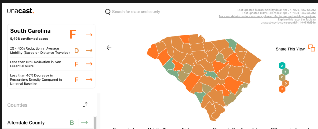 When it comes to social distancing, South Carolina is ranked at the bottom compared to the rest of the country. The latest data from Unacast — a company that purchases data from cell phone companies — shows that SC has become increasingly worse at social distancing in the past few days. The company now gives the Palmetto State an “F” for its lack of change in behavior overall since Feb.