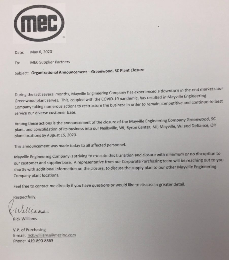 Greenwood South Carolina Manufacturing Plant Shutting Down