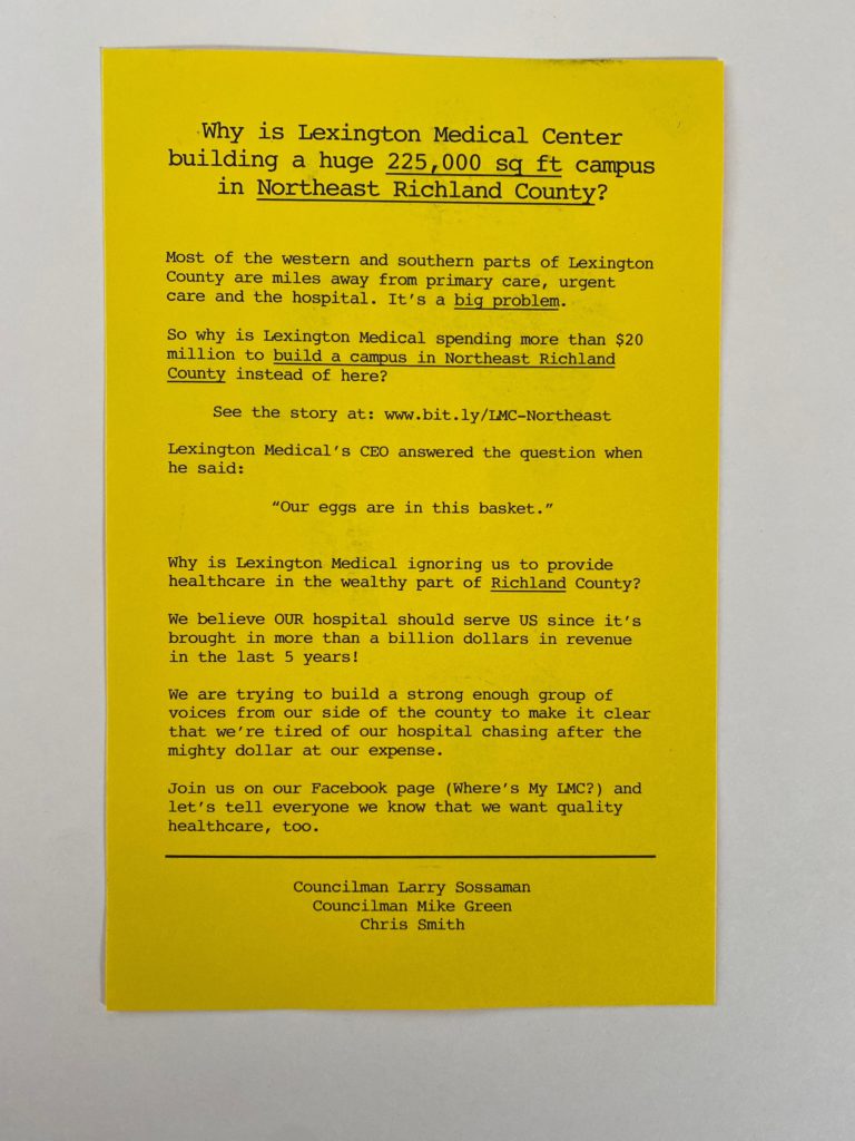 “Why is Lexington Medical ignoring us to provide health care in the wealthiest part of Richland county?” the mailing asked. “We believe OUR hospital should serve US since it’s brought in more than a billion dollars in revenue in the last five years!”