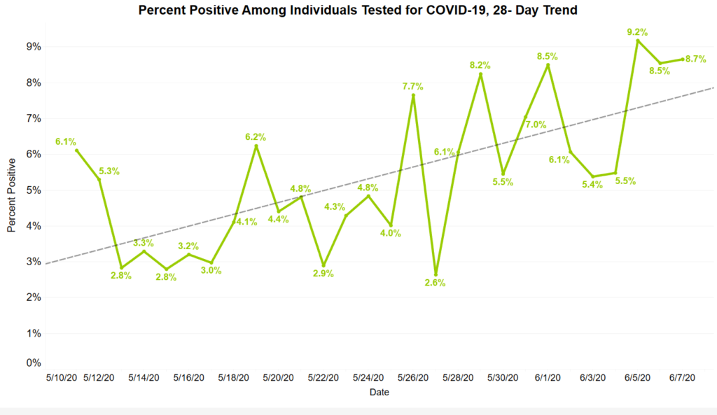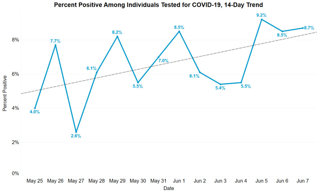 The recent surge is not necessarily due to the state’s expanded testing. The percentage of positive cases per tests has been ticking upward. On Monday, 8.7% of tests had positive results.