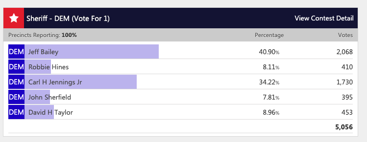 The Democratic primary — in which Taylor ran against five other democratic candidates — did not produce a winner Tuesday. Jeff Bailey took the majority of the votes, but not enough to win outright. The race will head to a runoff election on June 23.